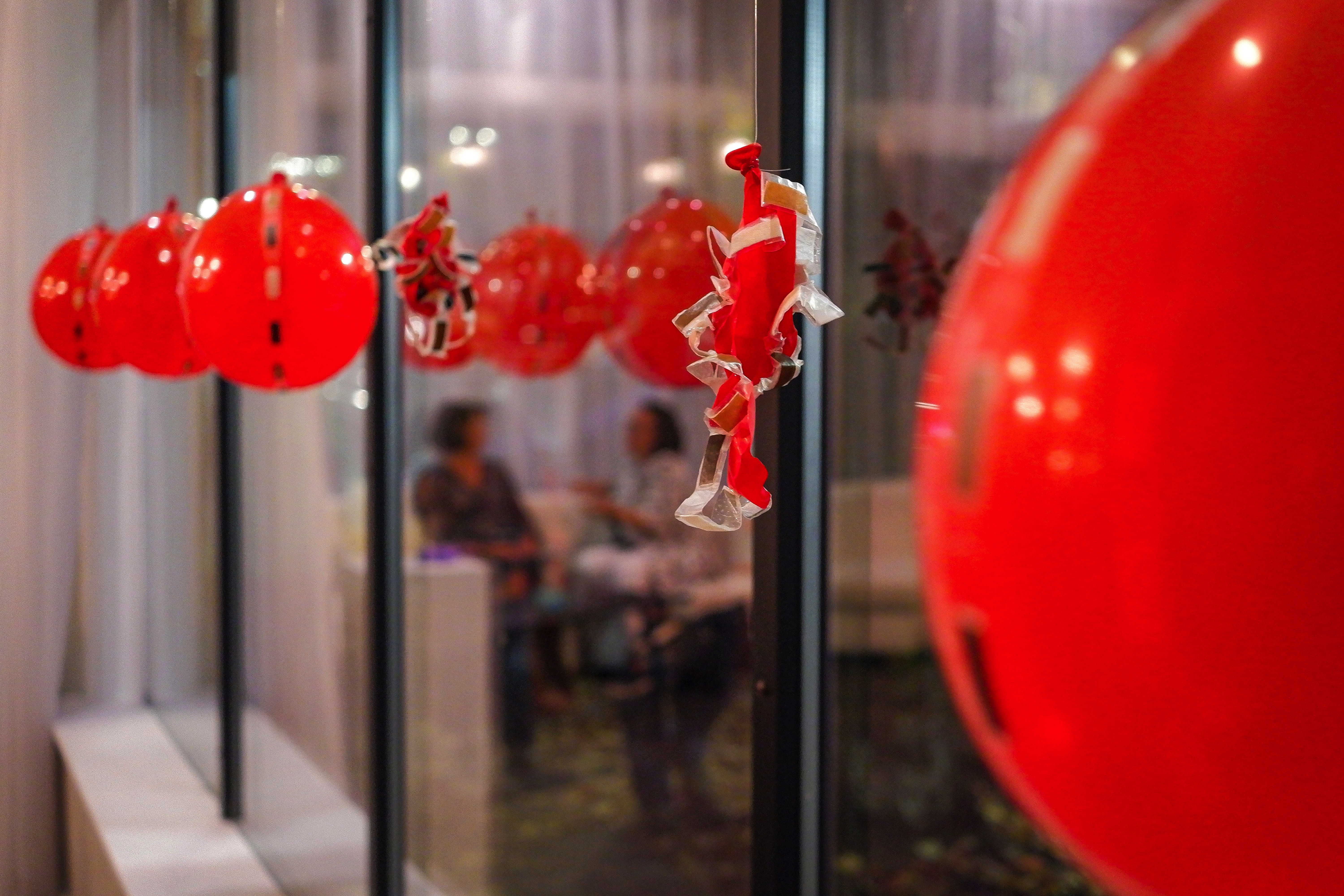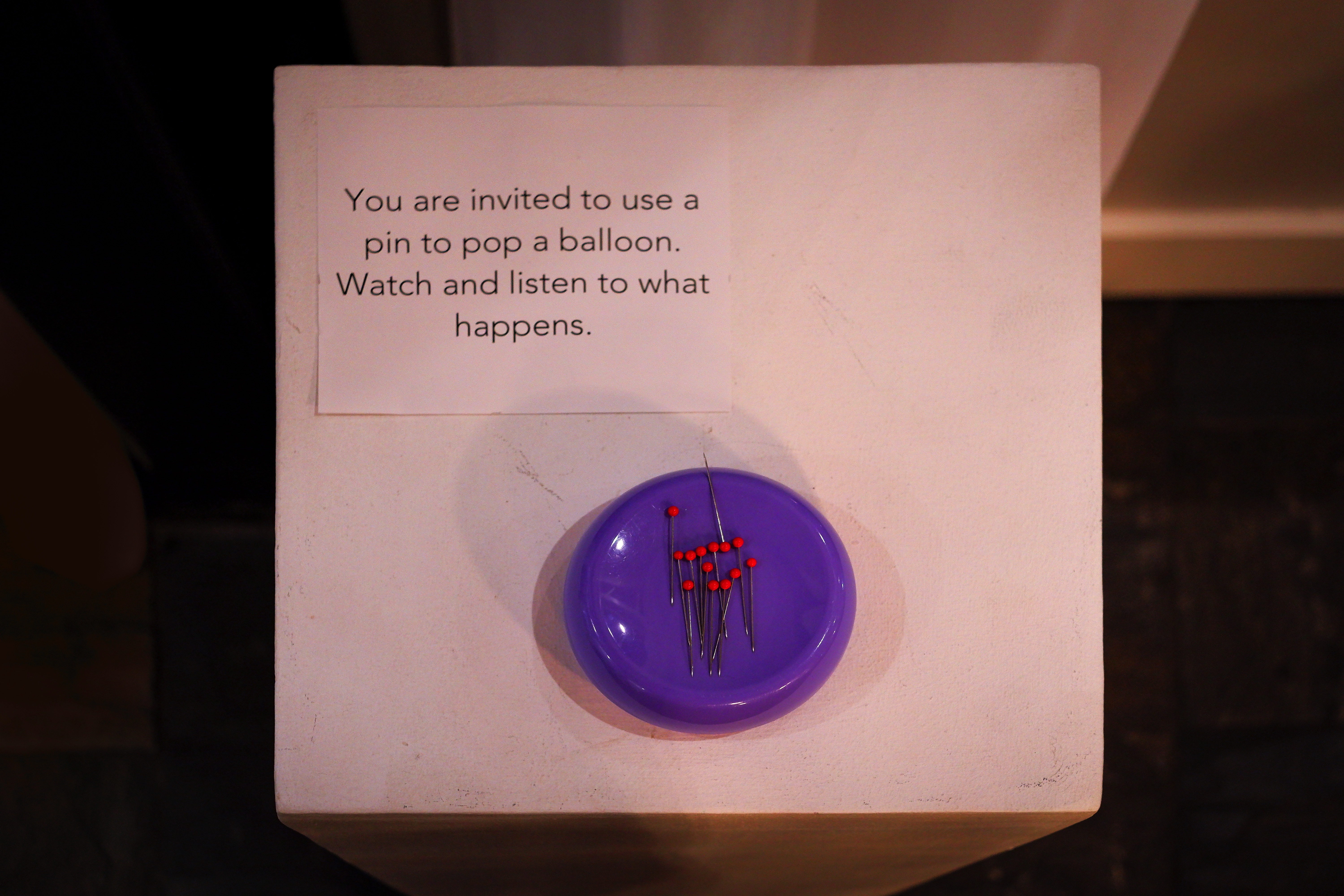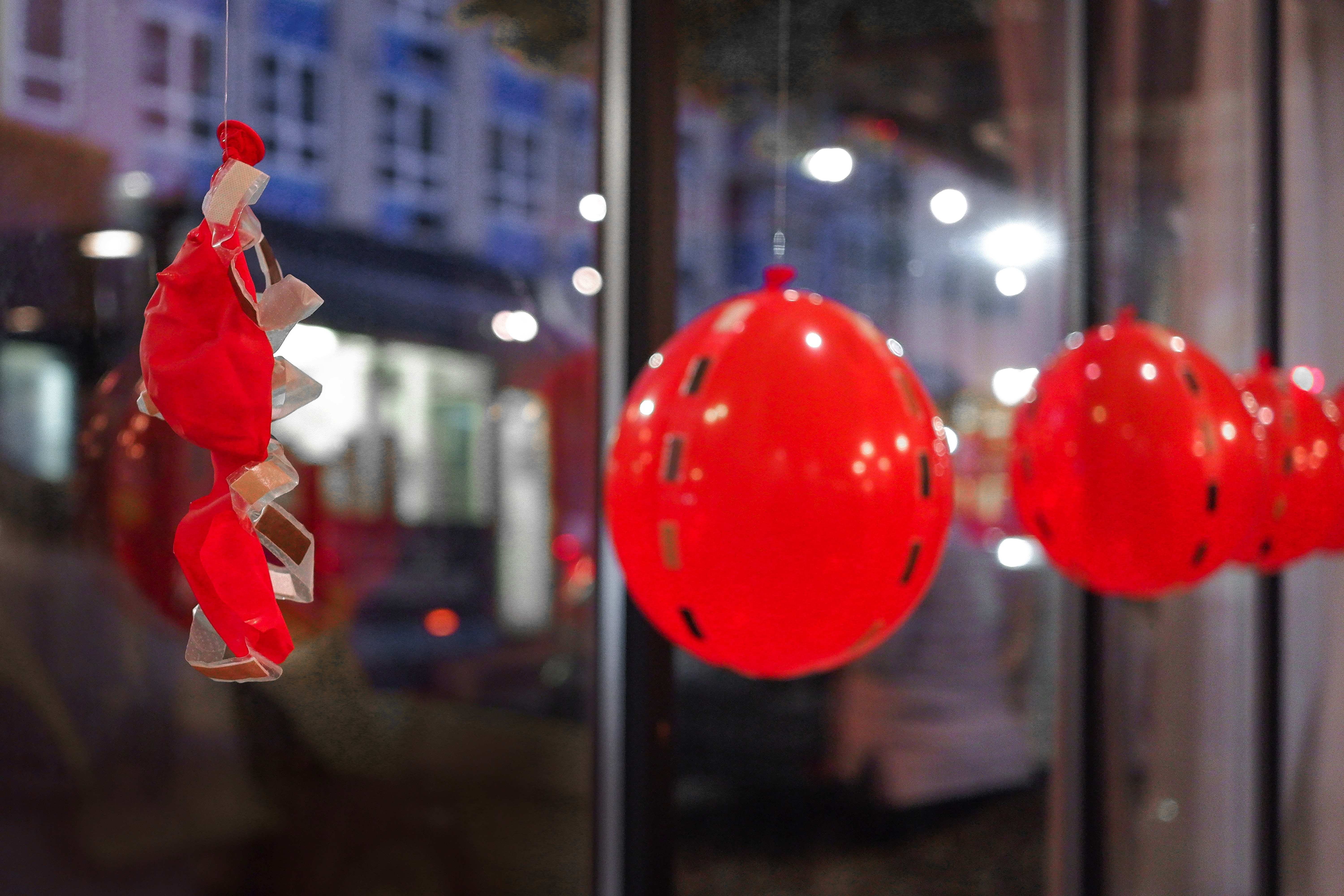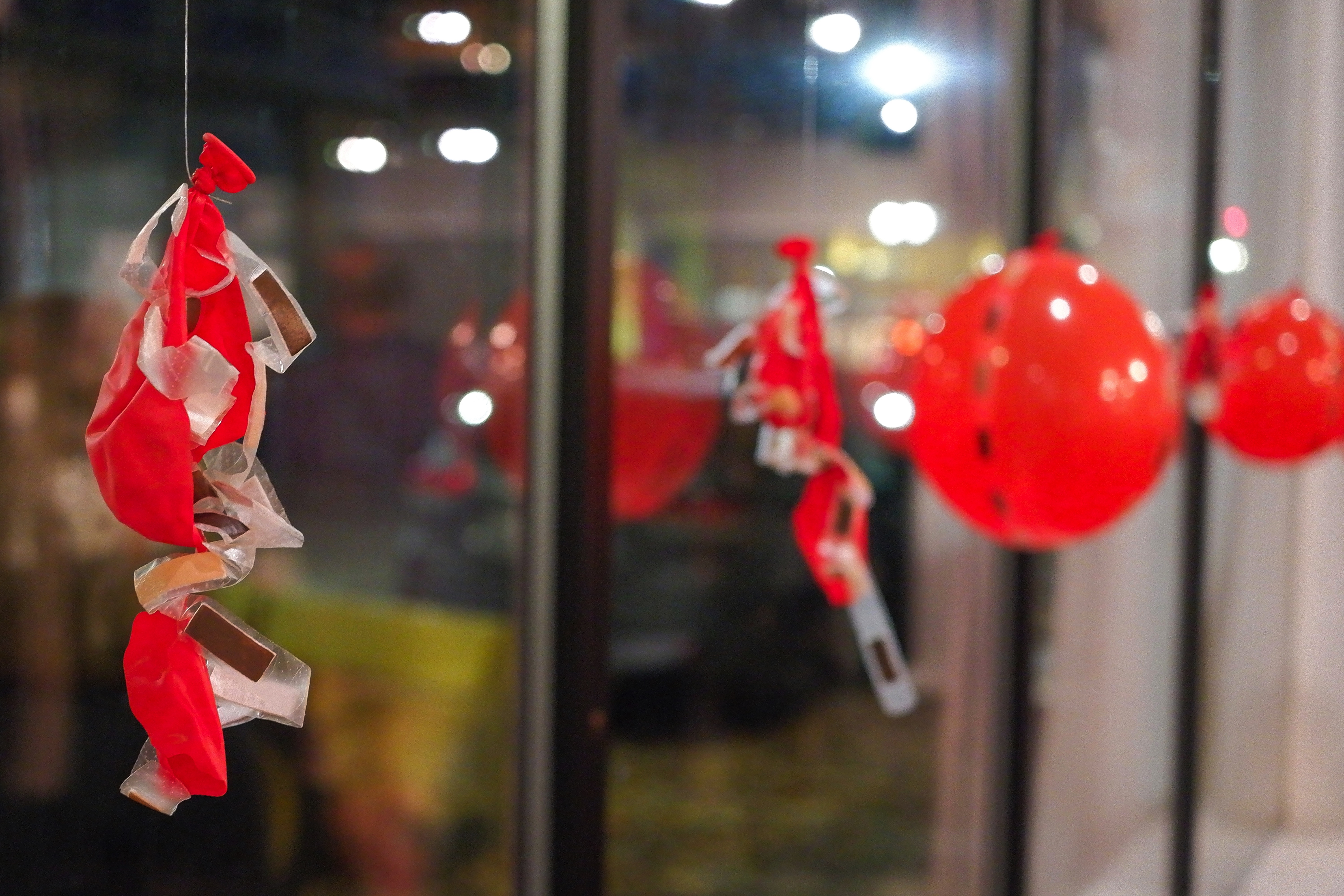 balloons with bandages painted with acrylic progressively popped by attendees over duration of event