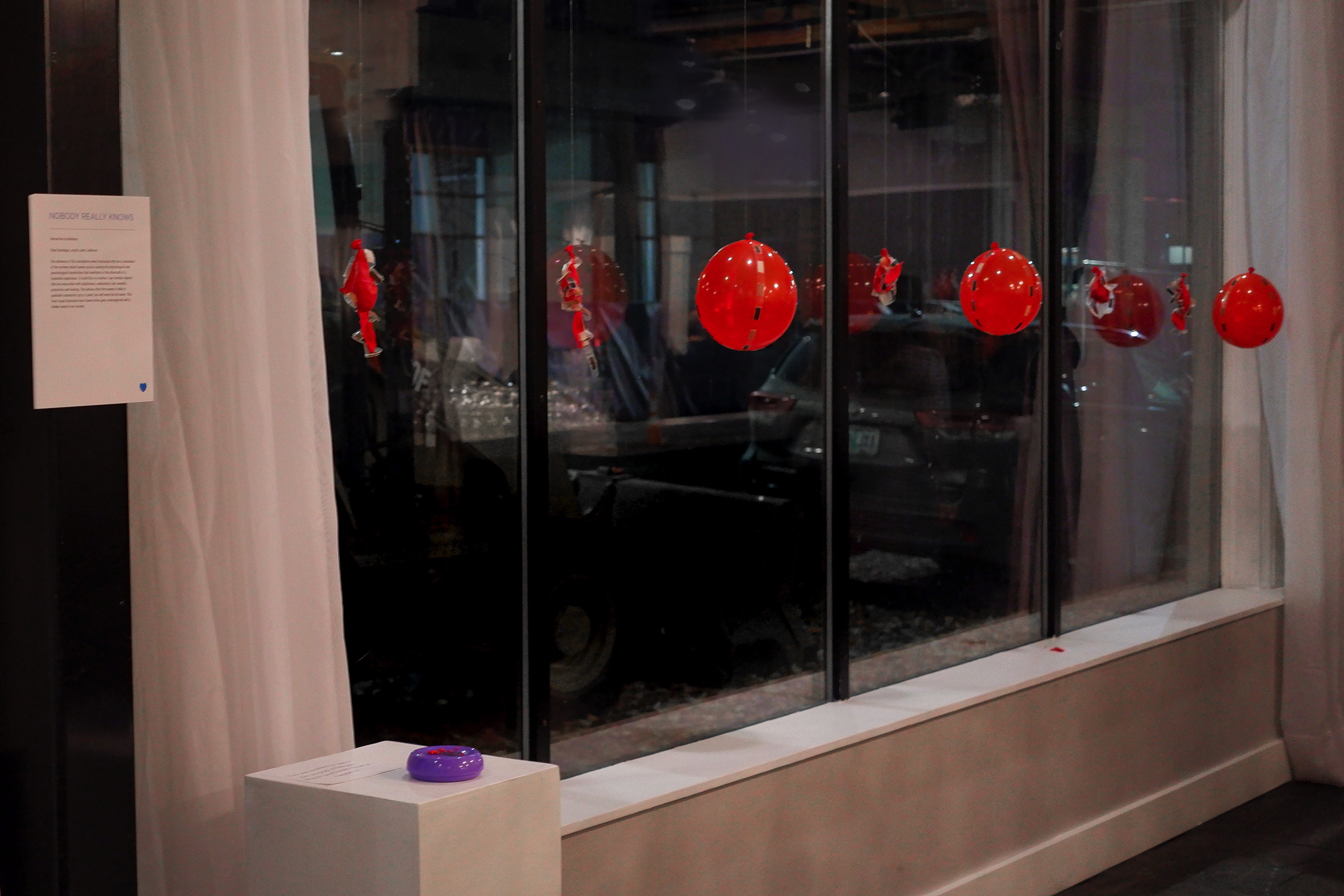 The elements of this installation when interacted with are a simulation of the moment when trauma occurs causing the physiological and psychological constriction that manifests in the aftermath of a traumatic experience. To build this re-creation I use familiar objects that are associated with playfulness, celebration, fear, wounds, protection and healing. The balloon after the trauma is able to gradually unconstrict up to a point, but will never be the same. This final visual illustrates how trauma often goes unrecognized and is hidden away in our society.