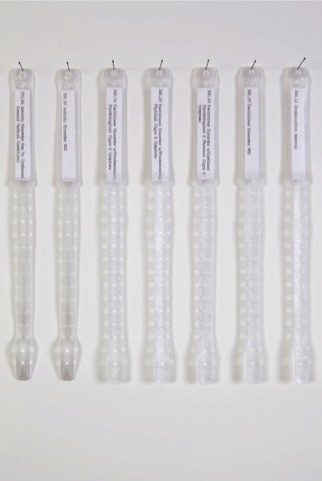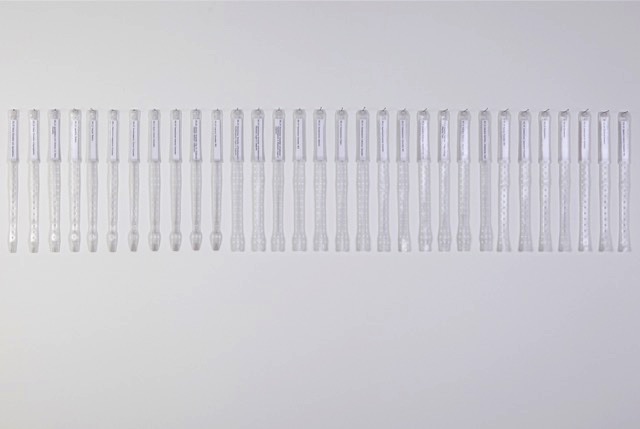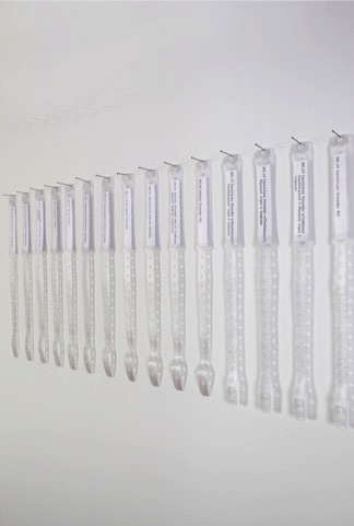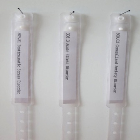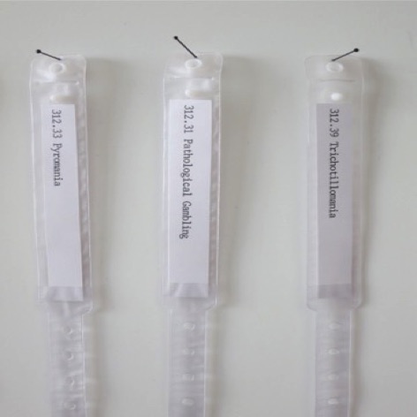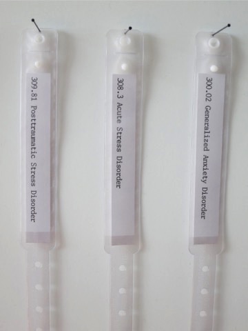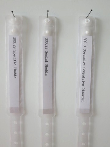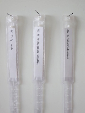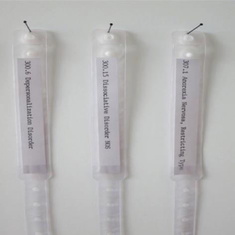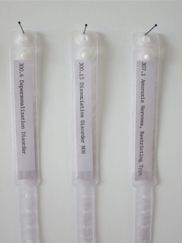 Cerebral Entities IV, 2011, installation, dimensions variable, 391 hospital wristbands, paper with typing, entomology pins