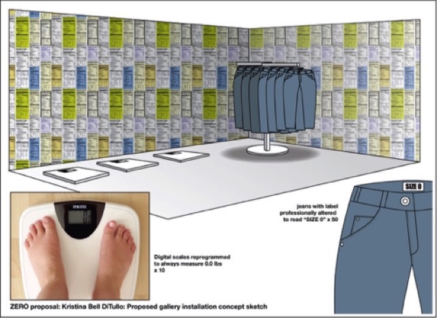Zero is an installation that centers around our culture's obsession with the number zero. The installation is a visual dialogue with the public on the topics of body image, the media and marketing in our culture, from size 0 jeans to 0 calories.